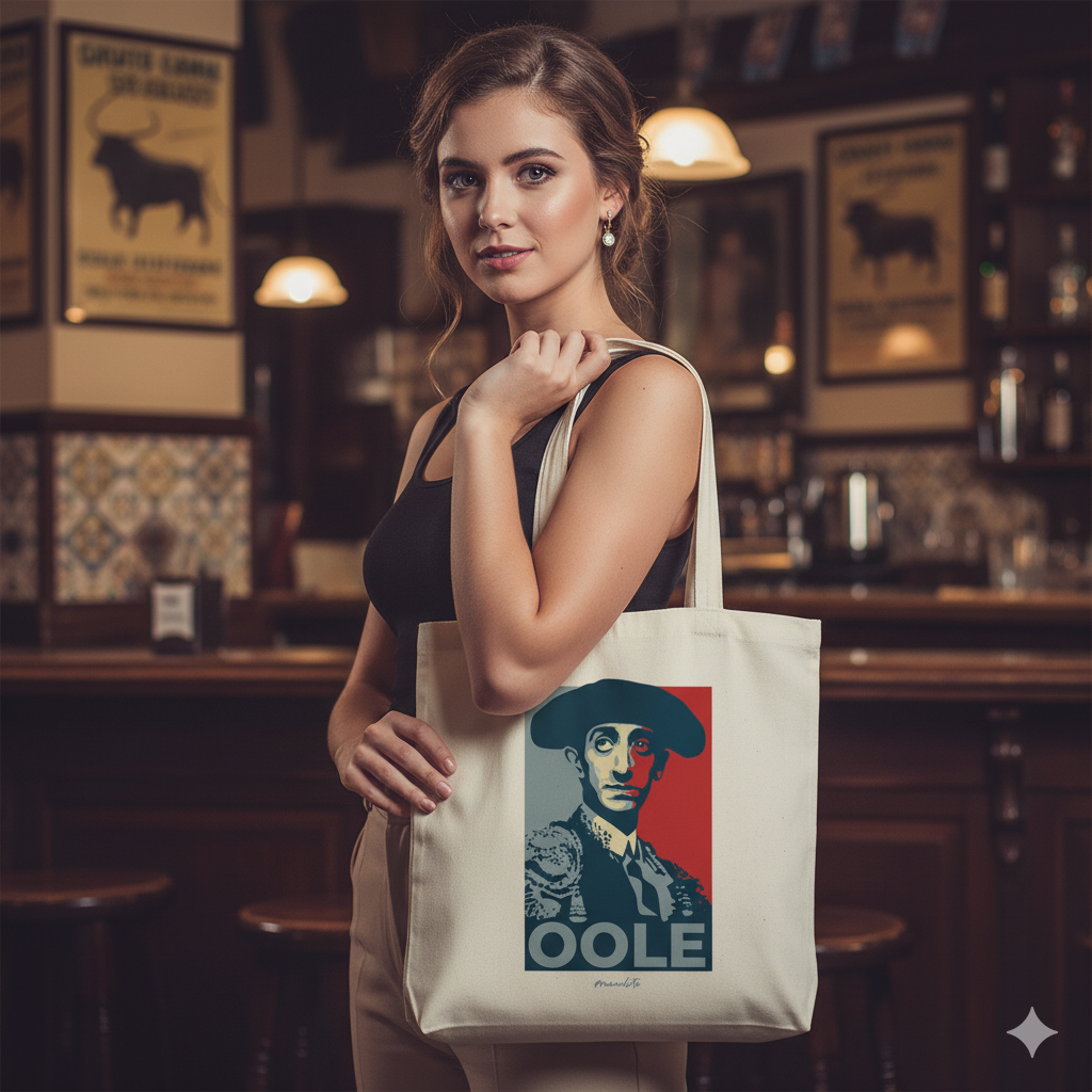 Totebag de Manolete con un diseño gráfico potente y divertido, inspirado en el estilo icónico de arte urbano de Shepard Fairey.